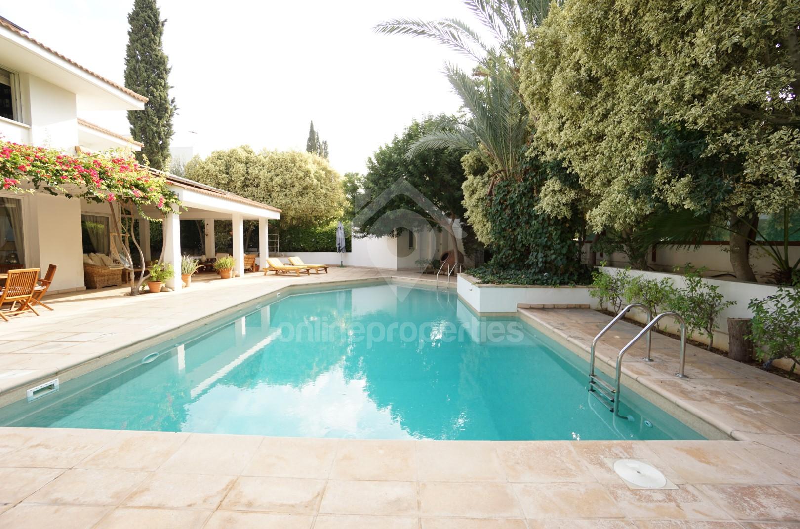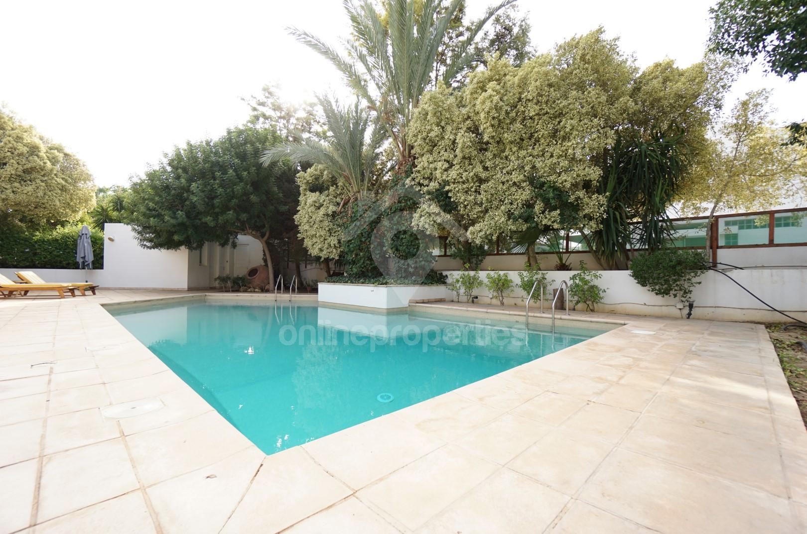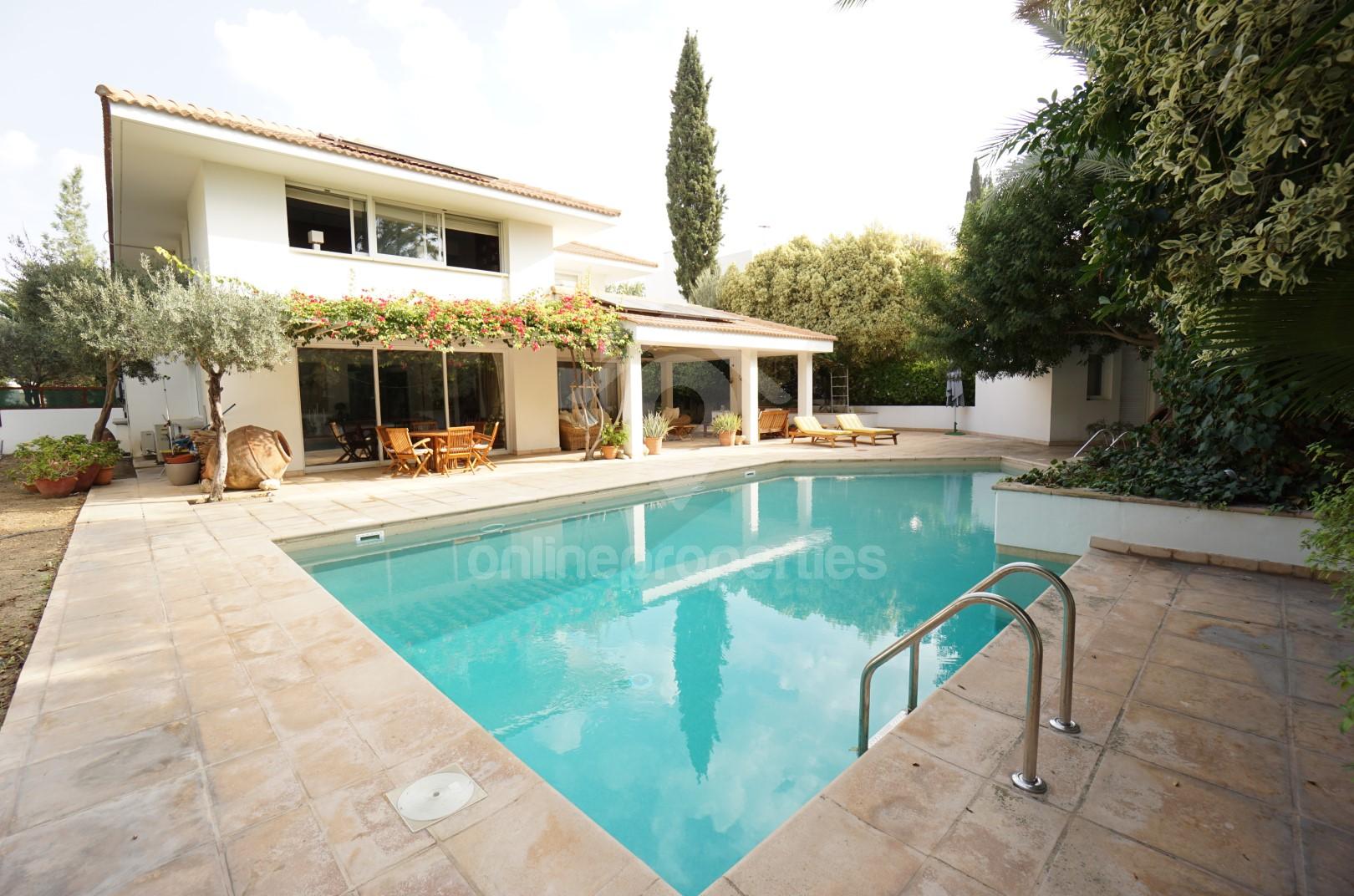 Undoubtedly the most superb residence available for at Engomi, located very close to Hilton Park Hotel. 842sm plot, 450sm covered areas, double garage and basement storage. 4 bedroom plus separate couple maids room detached villa with 70sm pool, fully furnished and in excellent like brand new condition. The ground floor consists of an impressive entrance with mature garden, a lobby entrance, a quest toilet with reception, a separate study/TV room with fire place, separate refurbished kitchen with another living room and professional electrical appliances, laundry room, and another spacious living/dining room with view to the pool and garden. The first floor consists of 4 bedrooms that 2 of them have en suite shower, the main bedroom includes a separate dressing room, and the ensuite has full bathtub and shower. A lot of attention was given to the outside area turning it into a small oasis with the pool, 50sm covered veranda and mature gardens. Very quiet neighbourhood and the villa is in a Cul de sac street. The plot of land has street front to 2 diffe streets, the third side of the plot is attached to a green area with nice trees and the fourth side of the plot is adjacent to the land of a much more bigger house; providing a lot of privacy to the house. Extra value added by features like, central heating, AC, cable tv, 5 KW Photovoltaic, solid parquet flooring, burglary alarm system, remote controlled double garage, LED lighting, ample storage and closets, and multi use tiled basement storage. Directed to the most demanding tenants.