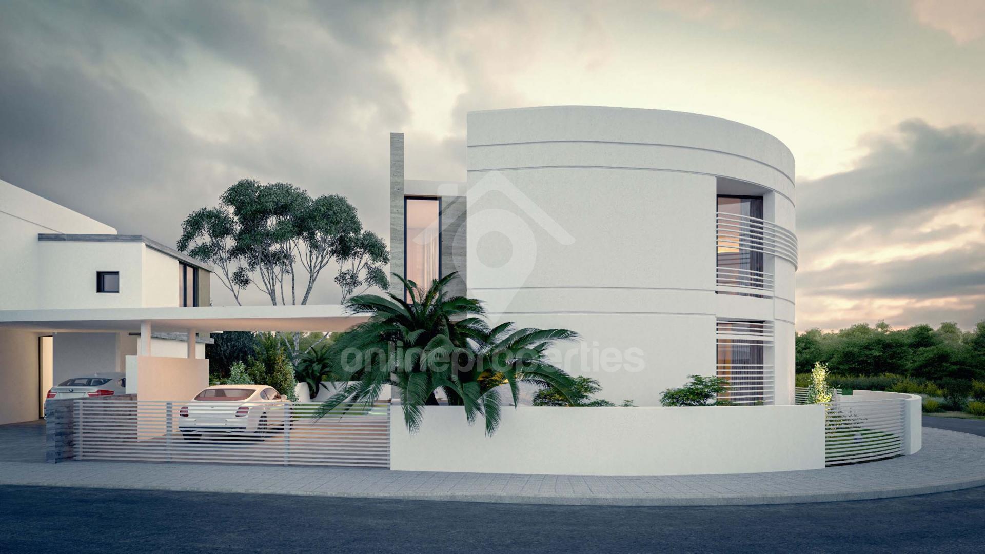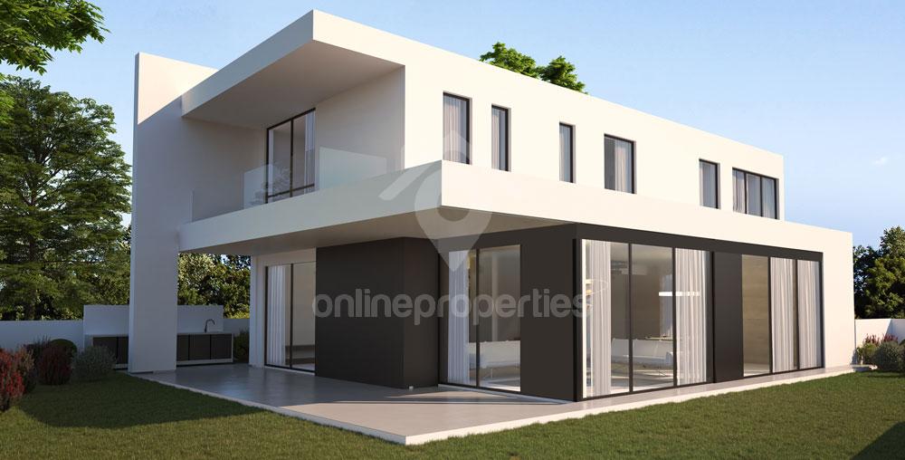 A contemporary designed corner house with a beautiful garden, double garage and terraces. On the ground floor it has a spacious open plan living room, dining room, family sitting with a modern kitchen all with a view to the garden, and a guest WC. On the first floor there is a small seating area, two bedrooms with en-suite bathroom and walk-in wardrobes and another two bedrooms that share a bathroom.Modern and minimal design with clean lines, finest of materials and extremely high standards all to all finishes around the house, large outdoors space, with covered verandas or landscaped garden with the possibility to add a swimming pool. Located in an excellent location with easy access to town and the high way, perfect place to call it a home. Class A’ Energy CertificateUnderfloor HeatingSound And Thermal InsulationSolar Water Heater Pressure SystemCeramic Tiles Or Parquet Or MarbleEntrance CameraTechnogranite Kitchen CountersProvision Of Alarm SystemProvision Of A/C UnitsThese villas are off plan and there is a selection of different sizes and layouts.