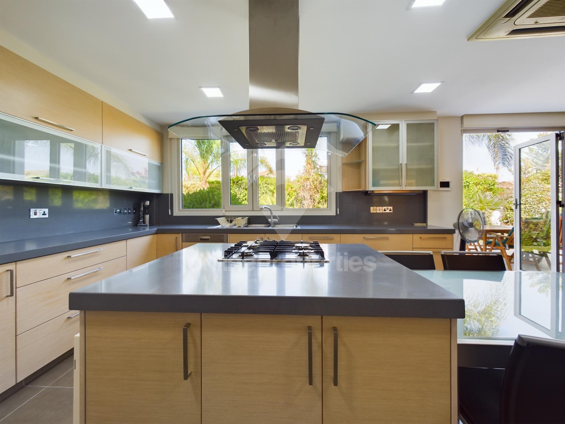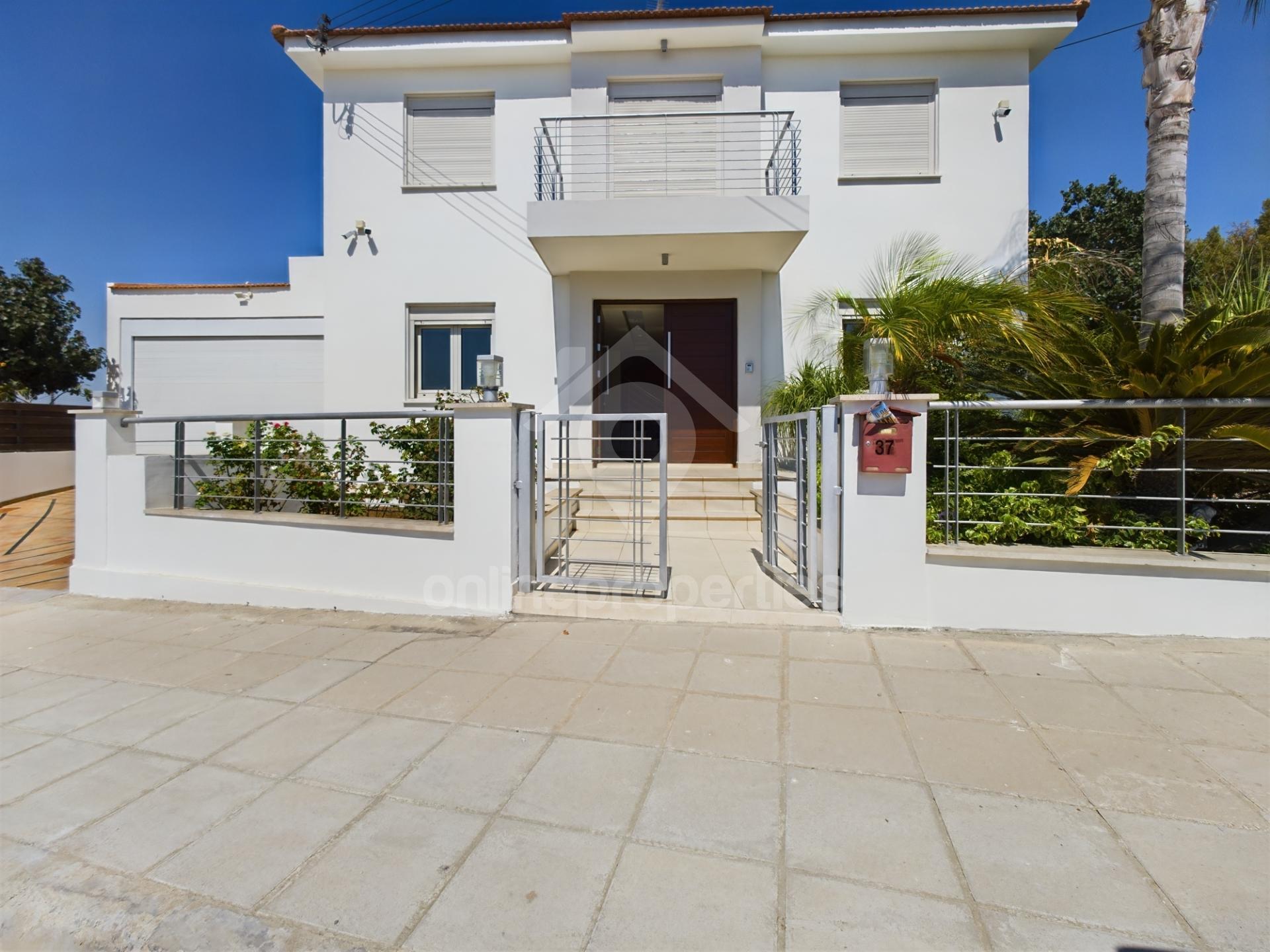 This amazing detached house features a large living room, a quest wc, separate kitchen with all modern appliances, kitchen island, comfortable sofas in the kitchen and a laundry room. Large glass doors leads you to a magnificent landscaped garden, with lots of greenery and small trees, garden furniture to enjoy your dinners al fresco or hosting stylish outdoor gatherings. A lovely path from the rear of the property leads you directly to the garden, through a secured separate entrance without entering the house. On the first floor there are four bedrooms, one with en suite and walk in closet , further three comfortable bedrooms who share the family bathroom. Bedrooms are extremely spacious, bright and airy, all have large wardrobes and A/C. There is also a small convenient kitchenet with a small fridge. The house now has a photovoltaic system reducing the electricity bill and making it a more energy efficient house.The garage is a valuable feature in this property, it offers secure and covered space for two vehicles, and plenty of extra storage space if needed.. It has a direct access to the living room and the kitchen through separate doors. The property comes semi furnished, there is a fire place that connects with a burner for hot water.