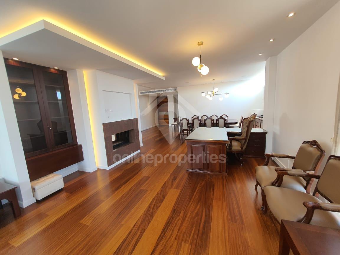 One-of-a-kind, partly furnished luxurious whole floor Penthouse with roof garden located at the border of Strovolos-Engomi in a 6-year-old modern building. Very large modern kitchen with separate laundry room, family room, large dining room, and double main lounge with two-sided wood fireplace. 3 large bedrooms all en suite (main with Jacuzzi) plus guest toilet plus maid's quarters (with bathroom and kitchenette). All bedroom windows with electric shutters. Fully A/C and underfloor C/H, alarm, wifi, and sound system throughout, Infinity swimming pool covered with sliding glass roof with solid wood decking on main floor plus roof garden with BBQ area. All electrical appliances and curtains included. 2 covered garages plus large storeroom. Large covered verandhas. AC, CH, deck, and pool maintenance are included in the rental. Total covered areas over 350m2.
