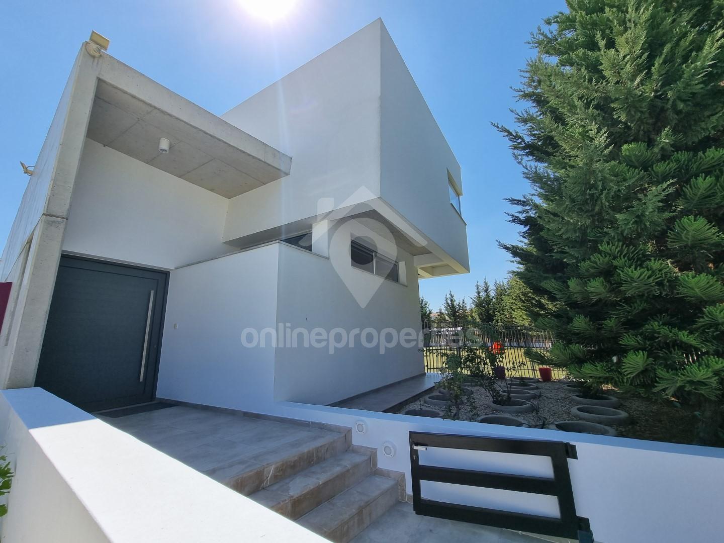 This superbly contemporary villa offers luxury accommodation with a high standard of living. The house has a unique modern design and it is built with the most expensive materials. On entering the house, there is a lounge with a dining room extended to a veranda viewing the swimming pool, a fully modern fitted kitchen with island and sitting area, panel room, and a guest w/c. On the upper level, there are four bedrooms, including the master bedroom with an en suite shower, another bedroom with an en suite, and a bathroom. The basement can be used as a maid's room or playroom and a covered parking space. Furthermore, it has underfloor heating, a VRV system, solar water heaters, and double glazing. Externally, it benefits from a big garden with a lovely swimming pool.Price includes pool and garden maintenance.